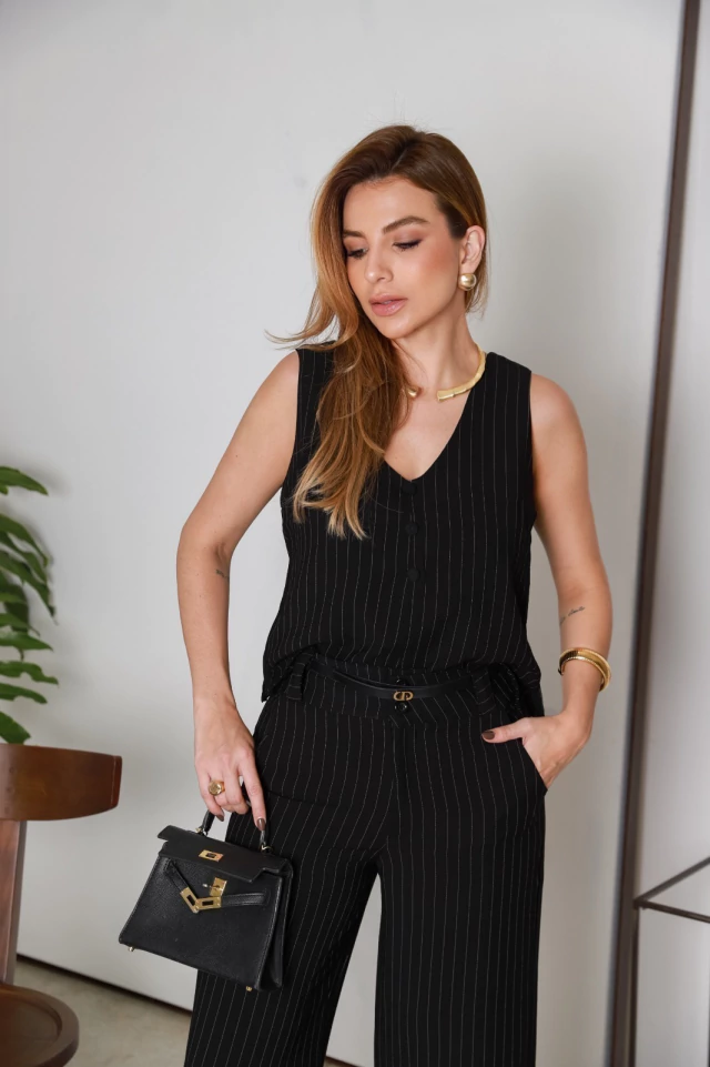 Conjunto alfaiataria risca de giz colete calça wide chique