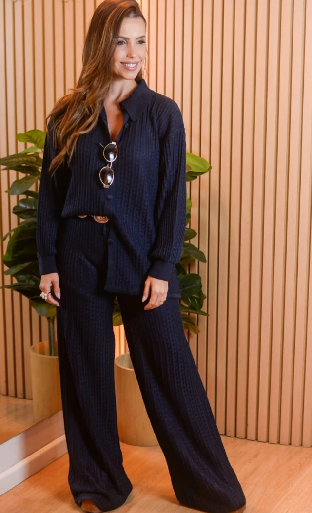 Descubra o equilíbrio perfeito entre conforto e estilo com o Conjunto Linha Canelado, que traz uma camisa soltinha e uma calça wide para um visual moderno e despojado.