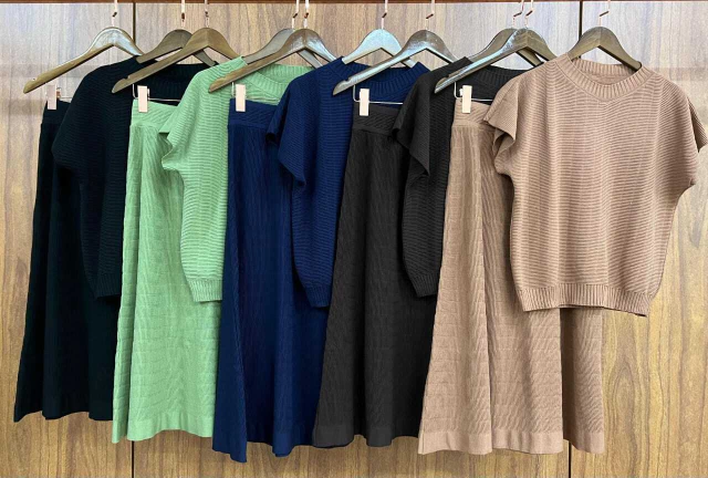 Transforme seu guarda-roupa com o Conjunto Modal Textura Tee Manga Soltinha Saia Evasê e esteja pronta para brilhar em qualquer situação!