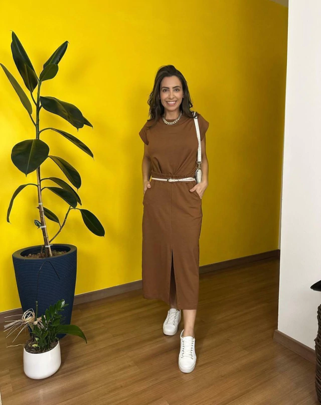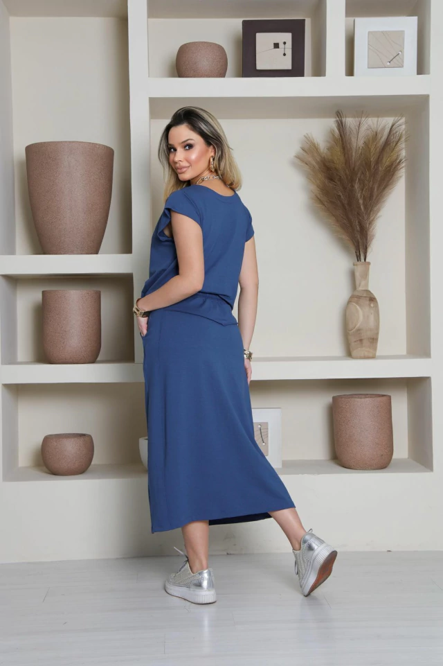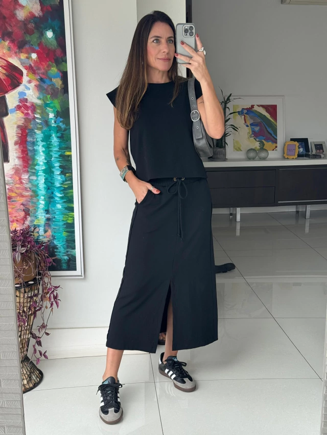 Características do Produto: - Confeccionado em moletinho de alta qualidade, garantindo conforto e durabilidade. - Tee muscle com modelagem moderna que destaca os ombros e proporciona estilo casual chic. - Saia midi com fenda lateral, que alia sensualidade e elegância para diversas ocasiões. - Versátil, perfeito para usar em dias mais fresquinhos ou combinar com sobreposições.