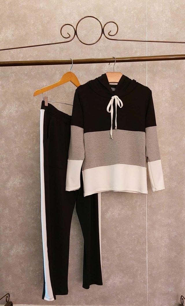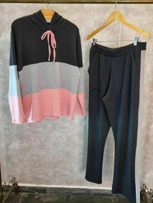 Atualize seu guarda-roupa com o Conjunto Moletinho Tricolor Capuz Listra Calça e sinta-se confortável e estilosa todos os dias!