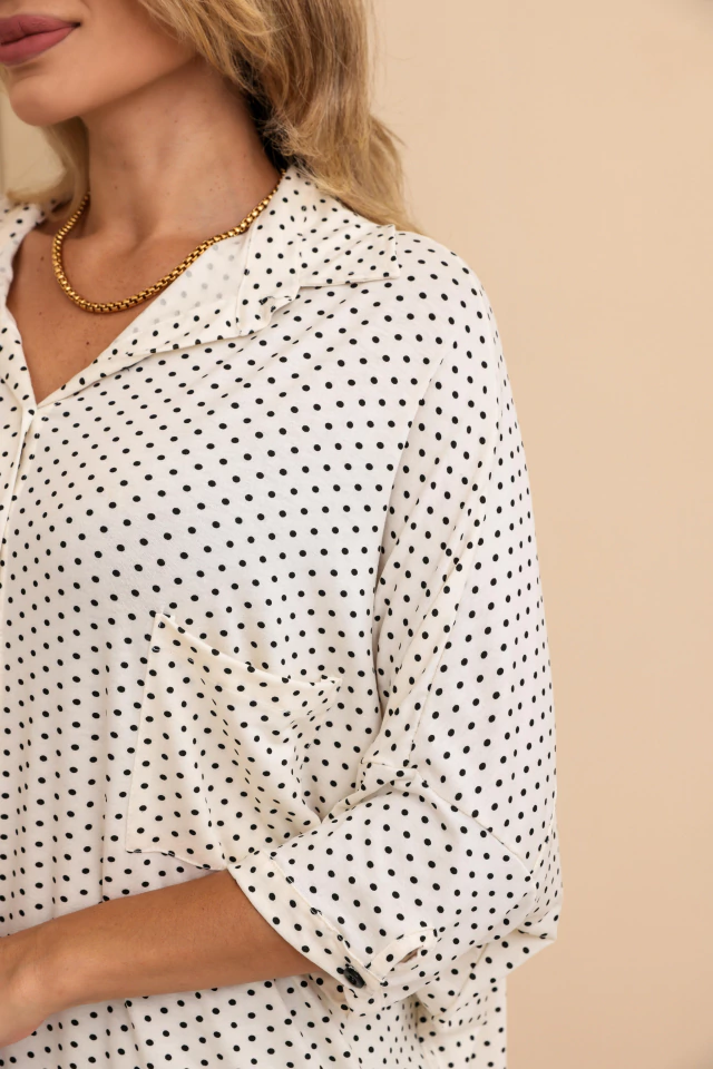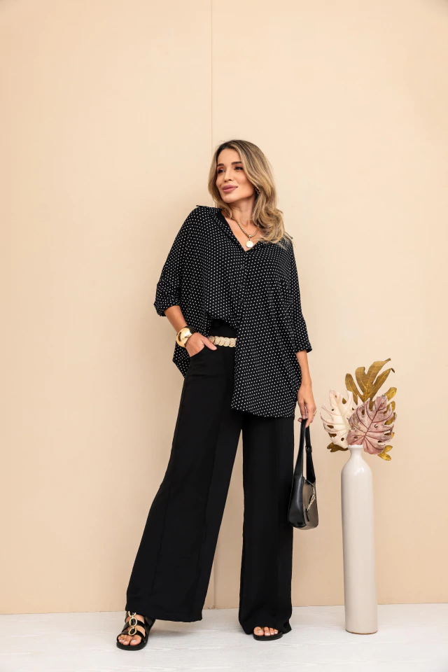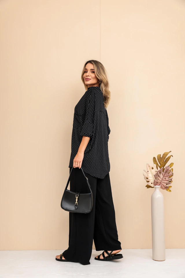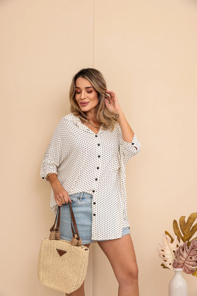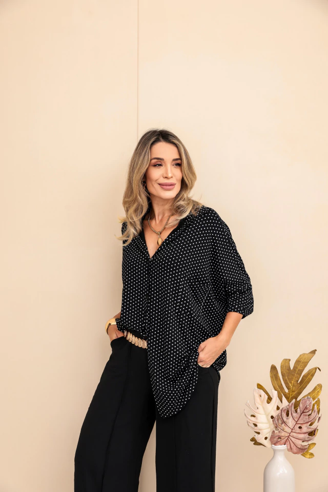 Invista na Maxi Camisa Viscolycra Poá Manga Cotovelo e experimente a união ideal entre conforto, elegância e versatilidade no seu dia a dia!