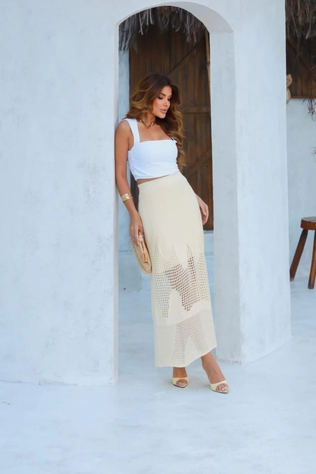 Invista na combinação perfeita entre estilo e conforto com esta saia modal midi furadinha — uma peça chave para valorizar seu look com charme e leveza!