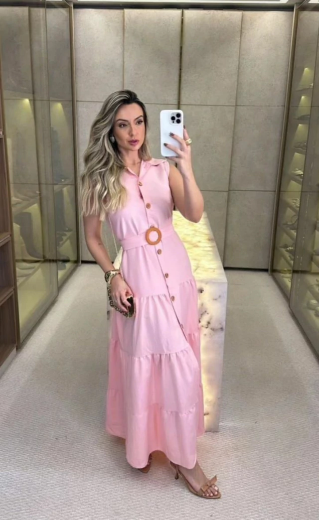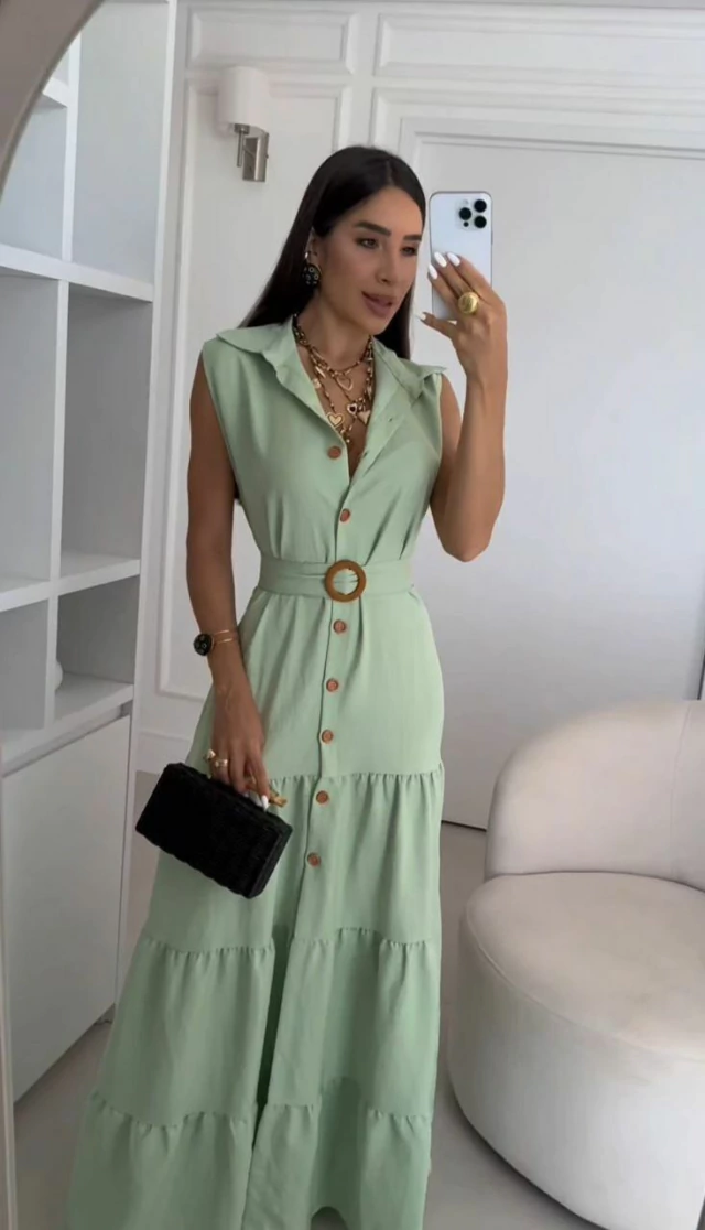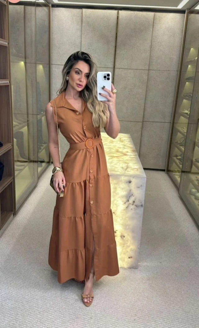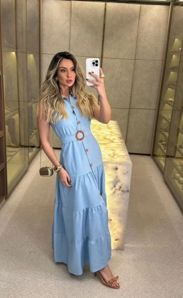 Não perca a oportunidade de brilhar! Garanta já o seu Vestido Sensoriale Longo Botões Regata Fivela e arrase em qualquer evento!